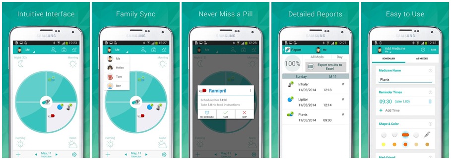 ในรูปซ้ายมือครับ เมื่อแอพเตือนจะมีเสียงเขย่ากระปุกยาพร้อมแสดงข้อมูลยาที่เราต้องทาน ถ้าเราทานแล้วก็กด TAKE หรือไม่ก็เขย่ามือถือของเราได้เลยครับแต่ถ้ายังไม่ทานอีกสักแปป กด SNOOZE ไปก่อน หรือเราคิดว่าจะไม่ทานแล้วกด SKIP ไปได้เลยส่วนจอที่สอง รูปกลางคือแสดงสถิติการทานยาของเราครับ สามารถกดส่งออกเป็นตาราง Excel ได้เลย